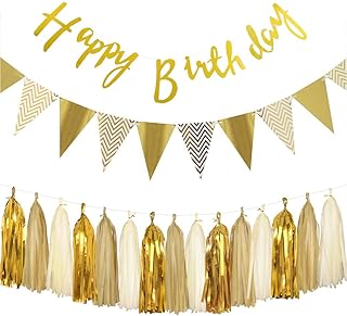 Gold Geburtstag Dekoration Set,Happy Birthday Banner, Paper Pennant Banner Triangle Flags With Tissue Paper Tassels Garland Paper Garland Birthday Decoration kindergeburtstag deko