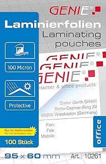 Genie 10784 Laminierfolien (Glasklar; 100 Mikron für bis zu Visitenkarten-Formate; geeignet für alle Heißlaminiergeräte; 95 x 60 mm) 25er Pack