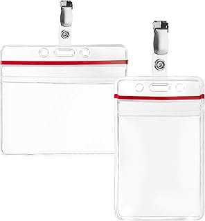 Karteo® Ausweishülle transparent horizontal mit Clip | Kartenhüllen Vinyl Plastik mit Farbbalken rot | für Karten Ausweise (86 x 54mm) benutzbar als Ausweishalter Kartenhalter