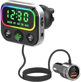 Bluetooth FM Transmitter 5.0 Bluetooth Adapter Auto Kfz Radio FM Transmitter mit QC3.0 Schnellladung, 7 LED Farblicht, Freisprecheinrichtung mit Mikrofon, Unterstützt TF Karte AUX Ausgang, Siri Google