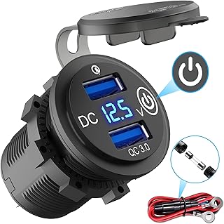 Quick Charge 3.0 USB Steckdose Auto mit Schalter, 12V KFZ Ladegerät USB Einbau Buchse Wasserdicht Zigarettenanzünder Dose mit blau LED Voltmeter Spannungsanzeige für Motorrad Boot LKW Wohnwagen